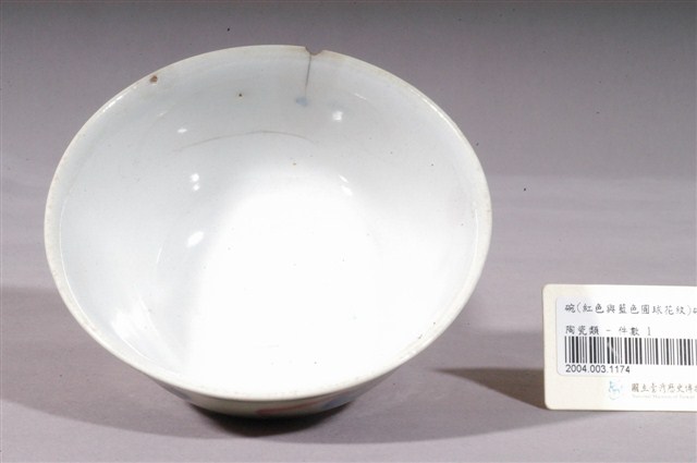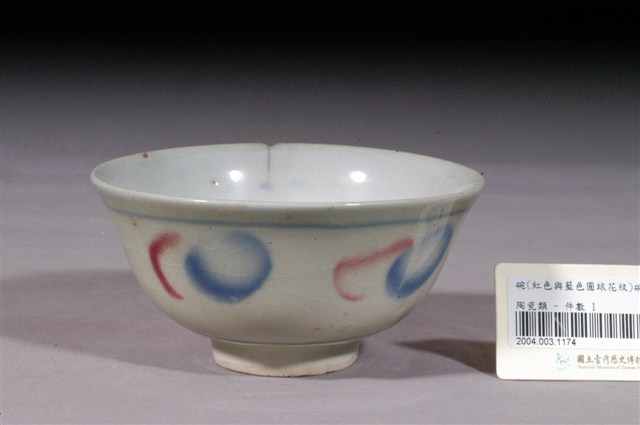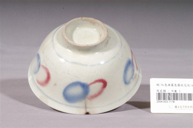 1.白釉紅藍圓球紋瓷碗,敞口,圓唇,圓腹下收接矮圈足,圈足露胎。全器施白釉,釉色光潔。口沿有磕損形成的缺口。內壁素面無紋;外壁口沿下方、壁身下端依靠轆轤的旋轉,用毛筆各畫有一道藍色弦紋,弦紋間噴繪有數個交疊的紅色與藍色圓球圖案,虛實相間,頗有意趣;圈足內底呈白色無落款。2.早期鶯歌的產品都用雕刻、壓印的方式做裝飾,開始生產碗盤之後才用手繪作紋飾。幾何紋圖案的特色是工整、規律而容易表現,手繪的紋飾則有意想不到的變化及美感。幾何形紋飾日治時期就非常流行,這種最簡單而易於操作的圖案可能也是陶瓷器皿上最早應用的紋飾。