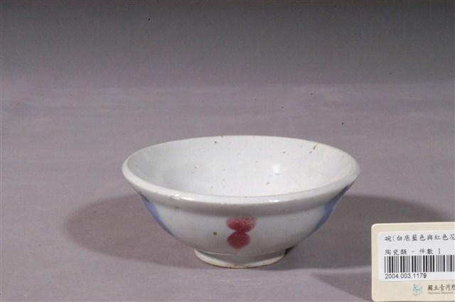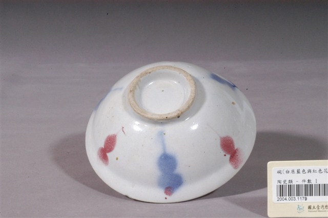 1.白釉藍紅倒葫蘆噴繪紋瓷碗。敞口,圓唇,折沿,淺弧腹,矮圈足。全器施白釉,釉色光潔;內壁素面無紋;外壁上以噴槍沾鈷藍及紅色染料在坯上噴繪倒葫蘆形圖案,形成工整規律的紋飾;圈足底刮釉露胎,內底呈白色無落款。2.葫蘆是傳統吉祥圖案,諧音「福祿」,其腹內結子繁盛,又象徵多子,故廣被應用於工藝美術品中,用以寄託期望福祿雙全,子孫萬代,大吉大利,世世昌榮之美好願景。倒葫蘆紋寓意「福祿到」,在美好祝福之餘更添趣味。