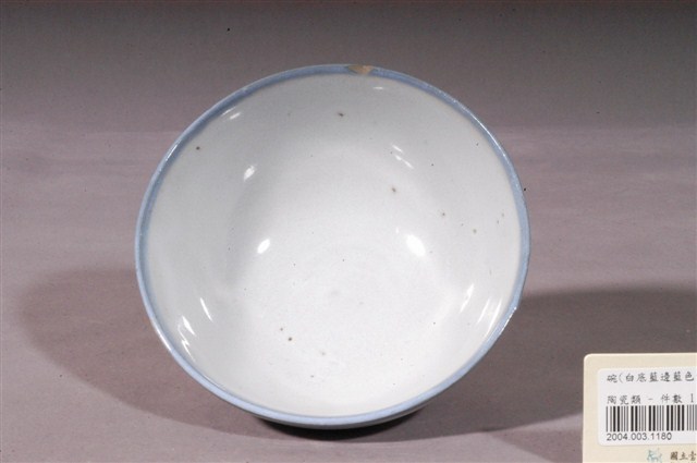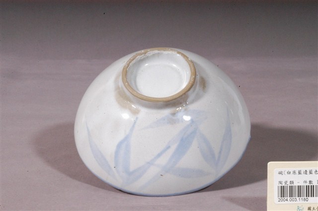 1.白釉藍邊藍葉彩繪紋瓷碗,敞口,圓唇,圓腹下收接矮圈足。全器施白釉,釉色光潔。口沿處塗成藍邊,且有一磕損造成的缺口。內壁素面無紋,只有數個燒製時產生的氣孔;外壁彩繪有淺藍色的樹葉圖案,樹葉細長娟秀,形態多變,十分秀美;圈足底刮釉露胎,內底呈白色無落款。2.花葉是常見的器物紋飾,以隨意的幾撇畫上類似花朵或葉子的符號,是民窯產品經常見到的紋飾。日治時代至戰後初期,陶瓷工廠彩繪的工作通常由女工來負責,這些沒有受過職前訓練的女工每人專畫一部份,並負責不同的色彩。這種情形就好像生產線上的分工一樣,多人共同將一種工作完成。