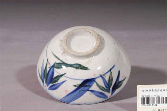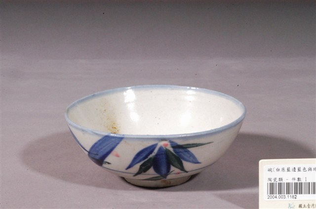 1.白釉藍邊紅點藍綠葉彩繪紋瓷碗,敞口,圓唇,圓腹下收接矮圈足。全器施白釉,釉色光潔。口沿處塗成藍邊。內壁素面無紋;外壁約二分之一處繪有一道藍色弦紋,弦紋上方彩繪有紅點藍綠葉圖案,細長舒展的藍綠色樹葉簇擁在一起,上方點綴著象徵紅花的粉紅色圓點,兩團葉紋之間還以一道較粗的藍色葉紋作為分隔,弦紋下方則彩繪有兩道綠葉葉紋,整體線條流暢俐落,風格簡約;圈足底刮釉露胎,內底呈白色無落款。2.花卉是最常見的器物紋飾之一。粉紅彩色料推測日治時期已經開始使用,以粉紅彩花朵加以枝葉做搭配是民窯產品經常見到的紋飾。日治時代至戰後初期,陶瓷工廠彩繪的工作通常由女工來負責,這些沒有受過職前訓練的女工每人專畫一部份,並負責不同的色彩。這種情形就好像生產線上的分工一樣,多人共同將一種工作完成。