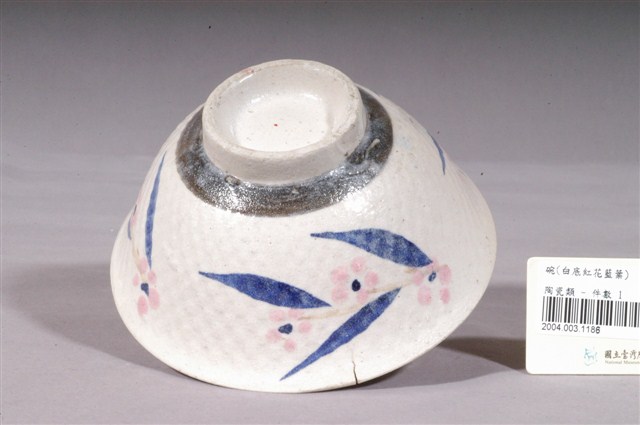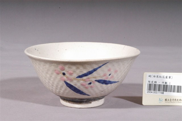 1.白釉紅花藍葉彩繪紋瓷碗,敞口,圓唇,圓腹下收接矮圈足。全器施白釉,口沿有一道裂口。內壁素面無紋;外壁以模具印出點狀花紋,並彩繪有三處紅花藍葉圖案,花朵呈盛開狀,共有五瓣,色澤粉紅,花芯點綴著藍色圓點代表花蕊,四周有藍色花葉與黃褐色枝條作為陪襯,清新明麗,外壁底部還依靠轆轤的旋轉,用毛筆畫有一道褐色弦紋,整體風格簡約大方。圈足內底呈白色無落款。2.花卉是最常見的器物紋飾之一。粉紅彩色料,其引進臺灣比釉下青花鈷料年代略晚,但推測日治時期已經開始使用,以粉紅彩花朵加以青花枝葉做搭配是民窯產品經常見到的紋飾。日治時代至戰後初期,陶瓷工廠彩繪的工作通常由女工來負責,這些沒有受過職前訓練的女工每人專畫一部份,並負責不同的色彩。這種情形就好像生產線上的分工一樣,多人共同將一種工作完成。