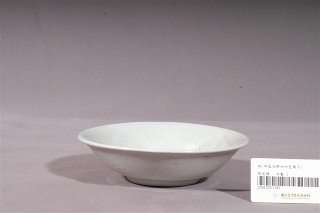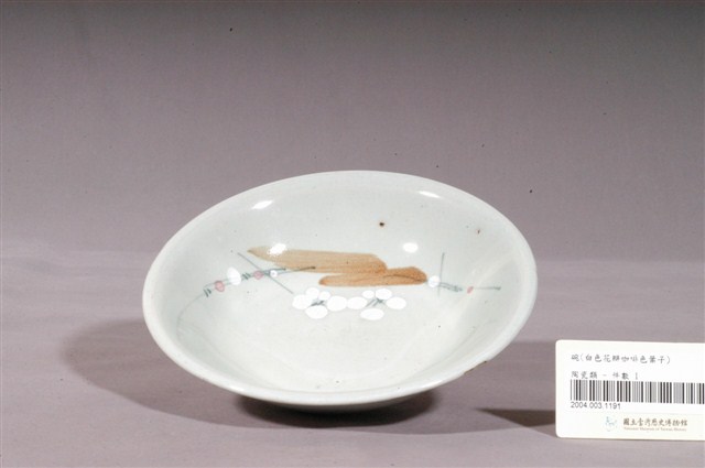 1.青釉白花咖啡葉彩繪紋瓷碗,撇口,圓唇,淺弧腹,矮圈足。碗外壁施白釉,素面無紋;內壁施青釉,釉色偏白。內壁彩繪有花葉圖案,兩朵白花位於碗心邊緣處,花分五瓣,花芯有綠色花蕊,小巧玲瓏,十分可愛,白花周圍以褐色花葉和綠色花莖作為襯托,花莖上還有象徵小花的紅白圓點,整體清新秀麗,風格簡約素雅。2.花卉是最常見的器物紋飾之一。以隨意的幾撇畫上類似花朵、葉子的符號,是民窯產品經常見到的紋飾。日治時代至戰後初期,陶瓷工廠彩繪的工作通常由女工來負責,這些沒有受過職前訓練的女工每人專畫一部份,並負責不同的色彩。這種情形就好像生產線上的分工一樣,多人共同將一種工作完成。