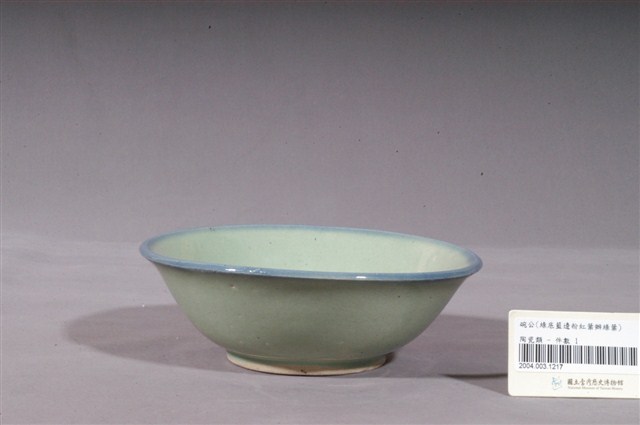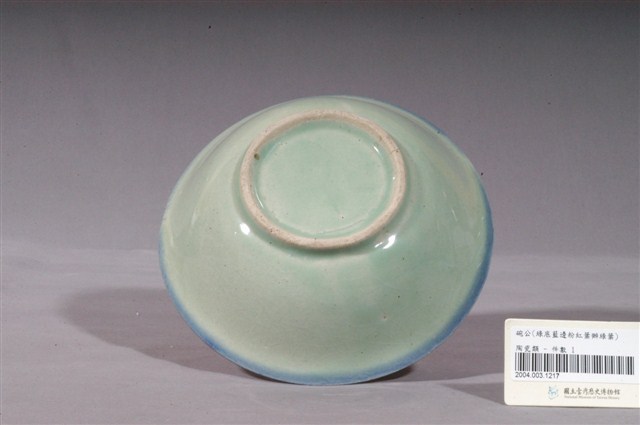 1.青釉藍邊粉花綠葉彩繪紋瓷碗,撇口,圓唇,淺弧腹,矮圈足。全器施青釉,釉色光潔。口沿塗成藍邊。碗外壁素面無紋;內壁彩繪有粉花綠葉圖案,一朵盛開的粉白色五瓣花位於碗心,花蕊呈綠色,花朵四周以粗細濃淡不一的綠色與咖啡色線條勾勒出莖葉作為襯托,整體線條俐落,風格簡約。圈足底刮釉露胎,內底無落款。2.花卉是最常見的器物紋飾之一。粉紅彩色料推測日治時期已經開始使用,以粉紅彩花朵加以枝葉做搭配是民窯產品經常見到的紋飾。日治時代至戰後初期,陶瓷工廠彩繪的工作通常由女工來負責,這些沒有受過職前訓練的女工每人專畫一部份,並負責不同的色彩。這種情形就好像生產線上的分工一樣,多人共同將一種工作完成。