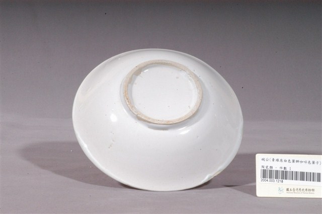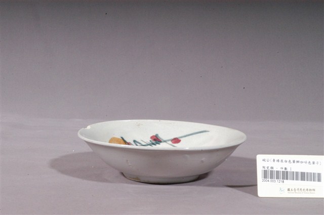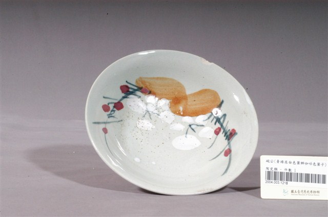 1.青釉白花綠葉紅果彩繪紋瓷碗,撇口,圓唇,淺弧腹,矮圈足。碗外壁施白釉,素面無紋;內壁施青釉,釉色偏白,釉面滿佈黑點。内壁彩繪有白花綠葉紅果圖案,白花分為五瓣,花芯點綴綠色花蕊,花朵周圍以綠色線條象徵花葉,花葉間綴有紅果,下方還有兩片咖啡色闊葉,整體色彩豐富,風格簡約素雅。圈足底刮釉露胎,內底呈白色無落款。2.花卉是最常見的器物紋飾之一。以隨意的幾撇畫上類似花朵、葉子的符號,是民窯產品經常見到的紋飾。日治時代至戰後初期,陶瓷工廠彩繪的工作通常由女工來負責,這些沒有受過職前訓練的女工每人專畫一部份,並負責不同的色彩。這種情形就好像生產線上的分工一樣,多人共同將一種工作完成。