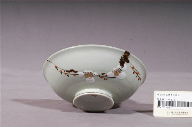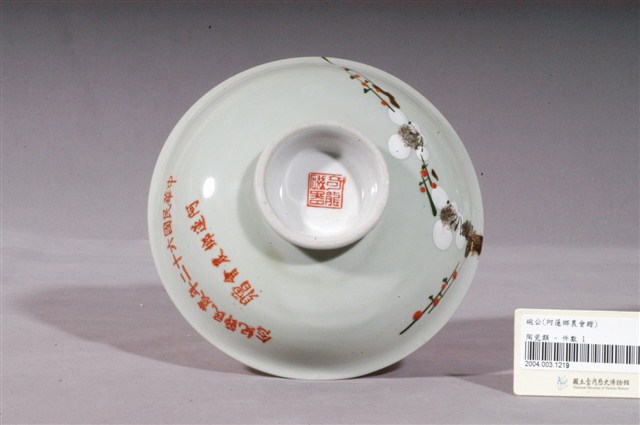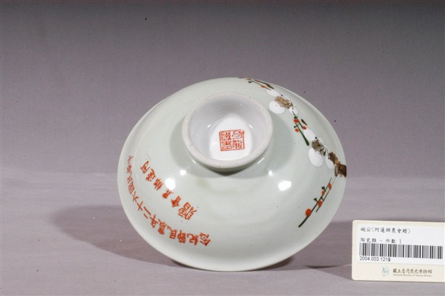 1.白釉印字白花綠葉紅果彩繪紋瓷碗蓋,敞口,圓唇、浅弧腹,矮圈足。全器施白釉,釉面光滑,碗蓋內壁素面無紋,外壁一側印有「中華民國六十二年農民節紀念 阿蓮鄉農會贈」紅色字樣,一側彩繪有白花綠葉紅果圖案,白花分為五瓣,花蕊呈淡金色,玲瓏可愛,白花周圍以深褐色和綠色釉彩勾勒莖葉作為襯托,莖葉上點綴有小紅果,整體風格寫意,清新典雅。圈足外側印有一圈燙金細線,底部中央印有「奇龍瓷器」的方框紅字落款。2.碗蓋底部有「奇龍瓷器」字樣,推測為「奇龍窯業公司」所製造,該公司是北投一家專製餐具的瓷器公司,由金義合陶器工廠衍生而來,產品品質很高。1933年臺北萬華人陳芳鑄從「臺灣窯業株式會社」與「大屯製陶所」聘請林士奇等七、八位技師,在萬華設立「金義合陶器工場」,專業生產餐具,成為臺北地區最早創立陶瓷廠的本島人。後來金義合的技術人員林士奇等人又出來自立窯場,先後直接間接地衍生了「永大」、「永豐」、「奇龍」、「陳永」、「淡江」與「江西」等專業燒製餐具瓷的窯場,使北投成為臺灣最重要的餐具瓷區。