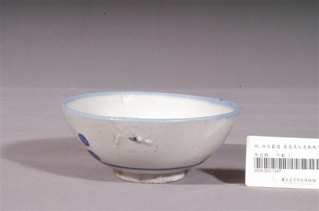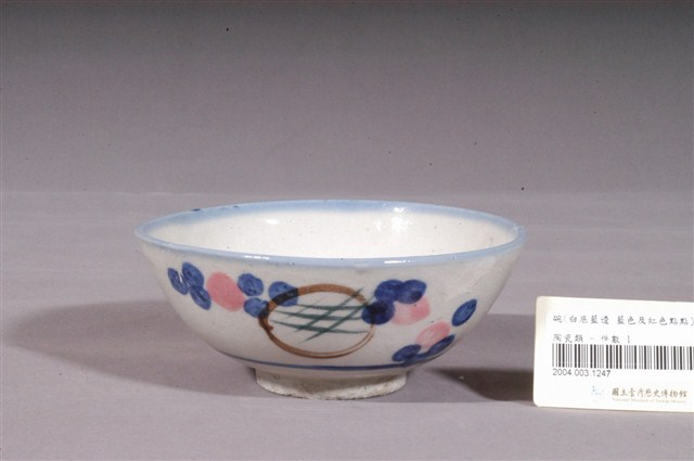1.彩繪幾何紋碗,敞口,弧壁下收,圓腹,底有圈足,以模具成形,於白色長石釉上裝飾彩釉之後,高溫燒製而成。全器施白釉,表面略微凹凸不平,碗外壁腹部中央可見顆粒狀凸起,圈足底露胎,略有缺損,胎色灰白。口沿以青色鈷料塗滿,發色較淡,碗內壁素面無紋,碗外壁下方飾一圈青花弦紋,腹部一側以褐、綠、青、粉紅釉彩手繪圓圈、菱格、圓點等幾何紋飾,豐富的色彩使簡單的圖案顯得活潑。2.粉紅彩紋飾經常出現在鶯歌碗盤中,這種釉彩的應用在日治時期已開始流行,戰後仍沿用許久。粉紅彩傳入臺灣後,臺灣北部窯廠紛紛開始模仿,由於鶯歌窯的發展在北投窯之後,當時許多北投窯的工人遷居到鶯歌,同時將紋飾帶去,因此推測粉紅釉彩的流行也是從北投傳到鶯歌。