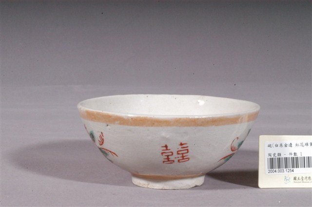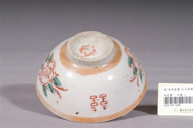 1.金黃閃光釉花卉囍字紋碗,以模具成形,施白釉高溫燒製後,再以金黃閃光釉與紅綠彩裝飾二次燒製而成。敞口,弧壁下收,圓腹,底有圈足,全器除圈足底外滿釉,外底心部分露胎,胎色米白,碗外壁開片,表面帶有明顯氣孔和褐色雜質斑點。碗內壁素面無紋,碗外壁口緣與近底處裝飾二圈寬邊金黃色閃光釉,上圈紋部分釉料磨損消失,腹部二側採銅版轉印貼繪技法裝飾二朵形似玫瑰的紅花,與二囍字紋交錯排列,花葉部分以綠色釉彩手繪填色裝飾,囍字稍不完整。外底心印有紅色正方形圈紋飾邊落款,內部字樣難以辨識,與前後物件2004.003.1253和2004.003.1255對照,應同為「其益出品」四字。2.金黃色閃光釉(Luster)是一種低溫釉上彩,燒製溫度約750℃,施在白色釉藥上,因色料中的金屬氧化物沈澱,使釉面產生金屬光澤。閃光釉發源於中東回教國家,傳入歐洲後成為廣受歡迎的裝飾技法,之後再經由日本傳到臺灣,約於1960年代至1970年代流行於臺灣北部窯廠,搭配吉祥字樣曾廣受宴會場合歡迎,但由於容易褪色,後來便不多見了。