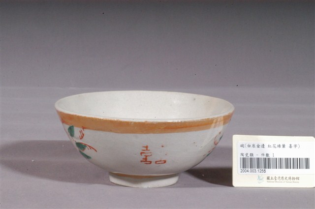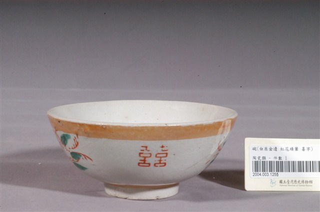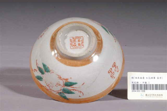 1.金黃閃光釉花卉囍字紋碗,以模具成形,施白釉高溫燒製後,再以金黃閃光釉與紅綠彩裝飾二次燒製而成。敞口,弧壁下收,圓腹,底有圈足,全器除圈足底露胎外滿釉,胎色米白。碗內外壁開片明顯,碗外壁口緣有一小缺口。碗內壁素面無紋,碗外壁口緣與近底處裝飾二圈寬邊金黃色閃光釉,上圈紋部分流釉,積釉部分顏色較深,腹部採銅版轉印貼繪技法裝飾二朵形似玫瑰的紅花,與二囍字紋交錯排列,花葉部分以綠色釉彩手繪填色裝飾,其中一朵玫瑰花瓣部分與一囍字紋右半未蓋印完整。外底心印有紅色正方形圈紋飾邊「其益出品」字樣落款,標示此碗出處。2.金黃色閃光釉(Luster)是一種低溫釉上彩,燒製溫度約750℃,施在白色釉藥上,因色料中的金屬氧化物沈澱,使釉面產生金屬光澤。閃光釉發源於中東回教國家,傳入歐洲後成為廣受歡迎的裝飾技法,之後再經由日本傳到臺灣,約於1960年代至1970年代流行於臺灣北部窯廠,搭配吉祥字樣曾廣受宴會場合歡迎,但由於容易褪色,後來便不多見了。