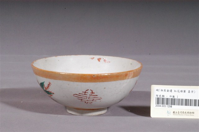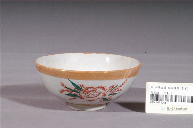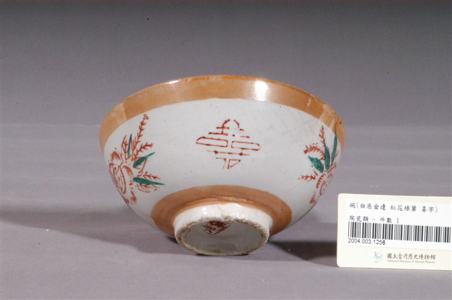 1.金黃閃光釉花卉囍字紋碗,以模具成形,施白釉高溫燒製後,再以金黃閃光釉與紅綠彩裝飾二次燒製而成。敞口,弧壁下收,圓腹,底有圈足,全器除圈足底露胎外滿釉,胎色灰白,足底凹凸不平並沾粘些許窯沙。碗內壁素面無紋,口緣內側沾染到幾點朱紅色釉料,腹部一側開片,碗外壁口緣與近底處裝飾二圈寬邊金黃色閃光釉,口沿積釉,釉色較深,腹部二側採印花技法蓋印二朵形似玫瑰的紅花,與二菱形囍字紋交錯排列,花葉部分以綠色釉彩手繪填色裝飾。外底心印有紅色正方形落款,右下角稍有缺失,但仍可辨識為「新藝」二字,標示著此碗的出處。2.金黃色閃光釉(Luster)是一種低溫釉上彩,燒製溫度約750℃,施在白色釉藥上,因色料中的金屬氧化物沈澱,使釉面產生金屬光澤。閃光釉發源於中東回教國家,傳入歐洲後成為廣受歡迎的裝飾技法,之後再經由日本傳到臺灣,約於1960年代至1970年代流行於臺灣北部窯廠,搭配吉祥字樣曾廣受宴會場合歡迎,但由於容易褪色,後來便不多見了。