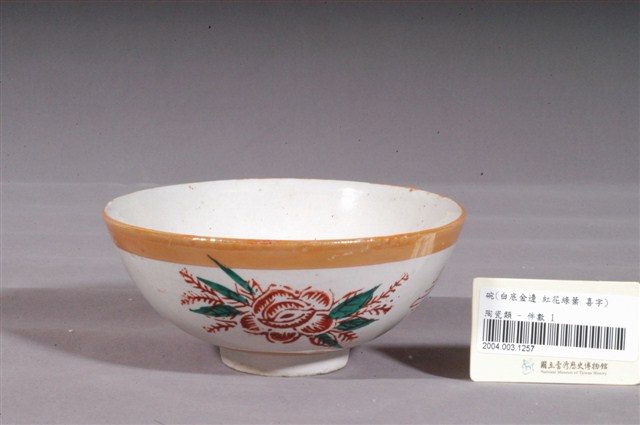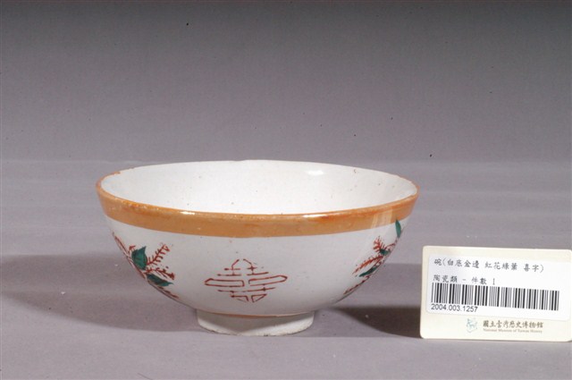 1.金黃閃光釉花卉囍字紋碗,以模具成形,施白釉高溫燒製後,再以金黃閃光釉與紅綠彩裝飾二次燒製而成。敞口,弧壁下收,圓腹,底有圈足,全器除圈足底露胎外滿釉,胎色灰白,圈足底有一小缺口。碗內壁素面無紋,表面可見明顯氣孔,口緣沾到二點朱紅色釉,碗外壁口緣與近底處裝飾二圈寬邊金黃色閃光釉,口沿積釉,釉色較深,腹部二側採印花技法蓋印二朵形似玫瑰的紅花,與二菱形囍字紋交錯排列,花葉部分以綠色釉彩手繪填色裝飾。外底心印有紅色正方形落款,左上與左下角稍有缺失,但仍可辨識為「新藝」二字,標示著此碗的出處。2.金黃色閃光釉(Luster)是一種低溫釉上彩,燒製溫度約750℃,施在白色釉藥上,因色料中的金屬氧化物沈澱,使釉面產生金屬光澤。閃光釉發源於中東回教國家,傳入歐洲後成為廣受歡迎的裝飾技法,之後再經由日本傳到臺灣,約於1960年代至1970年代流行於臺灣北部窯廠,搭配吉祥字樣曾廣受宴會場合歡迎,但由於容易褪色,後來便不多見了。