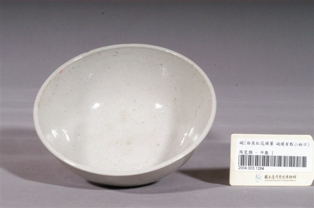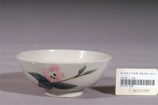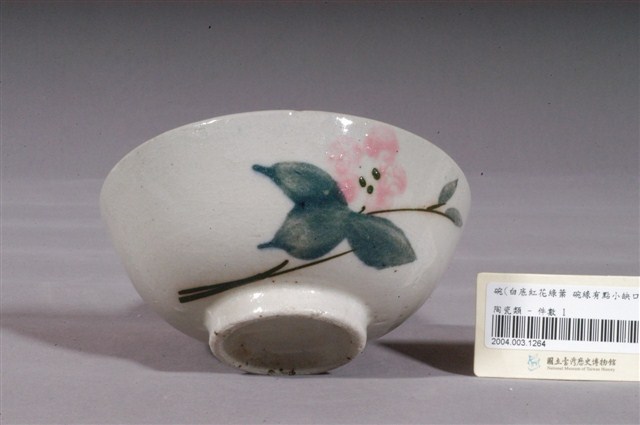 1.彩繪折枝花卉紋碗,敞口,口沿微斂,弧壁下收,圓腹,底有圈足,以模具成形,於白色長石釉上裝飾彩釉之後,高溫燒製而成。全器滿釉,表面帶有氣孔與雜質斑點,碗外壁細小開片,圈足沾粘少許窯沙呈凹凸不平,口沿有一角缺損。碗內壁素面無紋,碗外壁一側以深綠、黛綠、粉紅釉彩手繪折枝花卉,葉片飽滿,花朵色彩鮮豔,沒骨筆法純熟自然。2.粉紅彩紋飾經常出現在鶯歌碗盤中,這種釉彩的應用在日治時期已開始流行,戰後仍沿用許久。粉紅彩傳入臺灣後,臺灣北部窯廠紛紛開始模仿,由於鶯歌窯的發展在北投窯之後,當時許多北投窯的工人遷居到鶯歌,同時將紋飾帶去,因此推測粉紅釉彩的流行也是從北投傳到鶯歌。