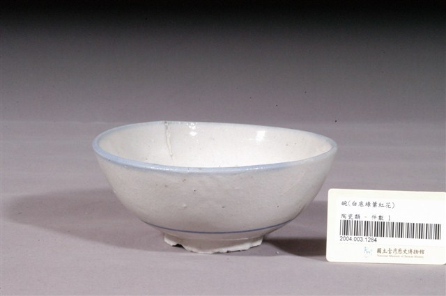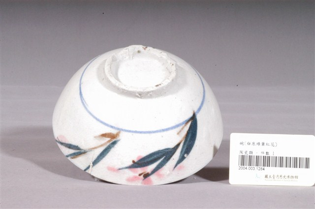 1.彩繪花卉紋碗,敞口,弧壁下收,圓腹,底有圈足,以模具成形,於白色長石釉上裝飾彩釉之後,高溫燒製而成,口緣一側內凹造成整體造型歪斜,圈足則多有缺損。全器滿釉,表面帶有氣孔與雜質斑點,內碗心尤其明顯。口沿以青色鈷料裝飾,發色較淡,施塗也不完整,部分未顯現青色,碗內壁素面無紋,碗外壁一側以褐、綠、粉紅釉彩,採沒骨技法手繪花卉紋,可能為蘭花之類的花朵。2.粉紅彩紋飾經常出現在鶯歌碗盤中,這種釉彩的應用在日治時期已開始流行,戰後仍沿用許久。粉紅彩傳入臺灣後,臺灣北部窯廠紛紛開始模仿,由於鶯歌窯的發展在北投窯之後,當時許多北投窯的工人遷居到鶯歌,同時將紋飾帶去,因此推測粉紅釉彩的流行也是從北投傳到鶯歌。