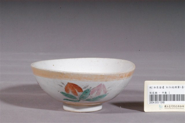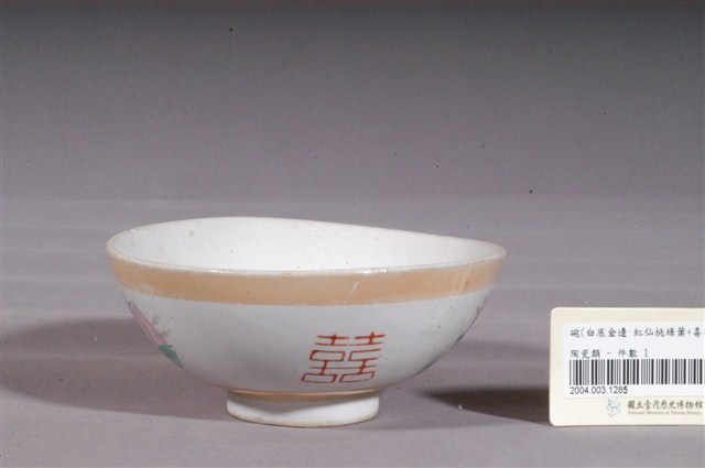 1.金黃閃光釉仙桃囍字紋碗,以模具成形,施白釉高溫燒製後,再以金黃閃光釉與紅綠彩裝飾二次燒製而成。敞口,弧壁下收,圓腹,底有圈足,口沿上下波浪狀起伏,整體造型略微歪斜。全器除圈足底露胎外滿釉,胎色灰褐。碗內壁素面無紋,碗外壁口緣與近底處裝飾二圈寬邊金黃色閃光釉,上圈紋部分磨損褪色,腹部二側採印花技法,沾黑色釉料蓋印二顆仙桃與葉子輪廓,再以綠、紅、粉紅釉彩手繪填色,仙桃之間蓋印紅色囍字。2.金黃色閃光釉(Luster)是一種低溫釉上彩,燒製溫度約750℃,施在白色釉藥上,因色料中的金屬氧化物沈澱,使釉面產生金屬光澤。閃光釉發源於中東回教國家,傳入歐洲後成為廣受歡迎的裝飾技法,之後再經由日本傳到臺灣,約於1960年代至1970年代流行於臺灣北部窯廠,搭配吉祥字樣曾廣受宴會場合歡迎,但由於容易褪色,後來便不多見了。