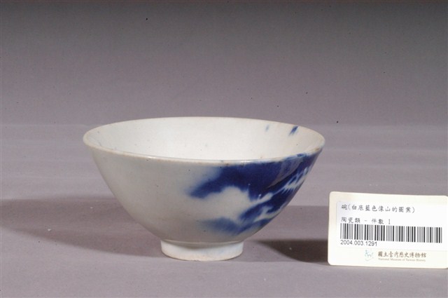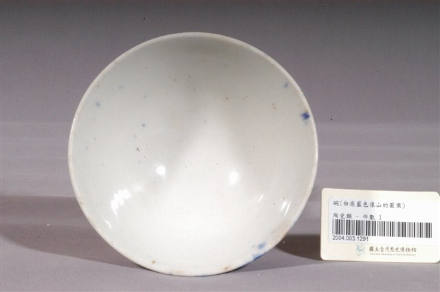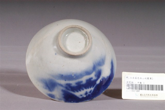 1.噴繪青花富士山紋碗,以模製成形,敞口,弧壁向下斜收至底,底有圈足。全器施白釉,表面帶有氣孔,圈足底露胎,胎色米白。碗內壁素面無紋,口緣有少許青色斑點,碗外壁一側採用噴繪技法,以青花鈷料裝飾富士山風景,因上釉藥的方式是使用噴槍,青花圖案發色深淺不一,也可見紋樣邊界的釉彩略微發散開來呈霧狀。2.噴繪技法是鐵片或銅版先將圖案做成鏤空的版型,再將版型貼近胚體,使用噴槍將色料噴上去,鏤空的地方沾上色料,被覆蓋的地方留白,燒製後即成所需圖案。噴繪技法是從日本引進,最早多用在富士山圖案的繪製,後來也設計出白兔、鶴紋、魚蝦等造型。