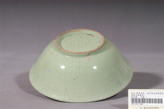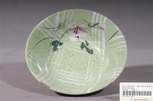 1.淡綠釉手繪花卉紋碗公,以模製成形,撇口,弧壁下收,圓腹,底有圈足。全器施淡綠釉,釉面開片明顯,外碗心略剝釉,圈足底露胎,胎色紅褐。碗外壁素面無紋,主要紋飾繪於碗內壁一側,以綠彩與粉紅彩描繪花卉紋,碗面刷毛白泥輕,由四條細直條紋組成四道寬帶,相互交錯形成格狀紋,作為背景以增添變化。碗內壁有多處褐色汙漬斑點,口沿有一長形缺口,都可見此碗被使用之歷史痕跡。2.碗的形制有分較大的湯碗和較小的飯碗,湯碗臺灣民間俗稱「碗公」,多用來盛裝菜湯,是臺灣家庭中常見的民生瓷器。