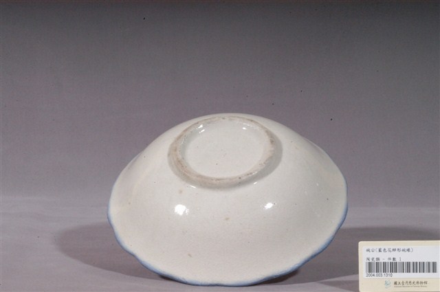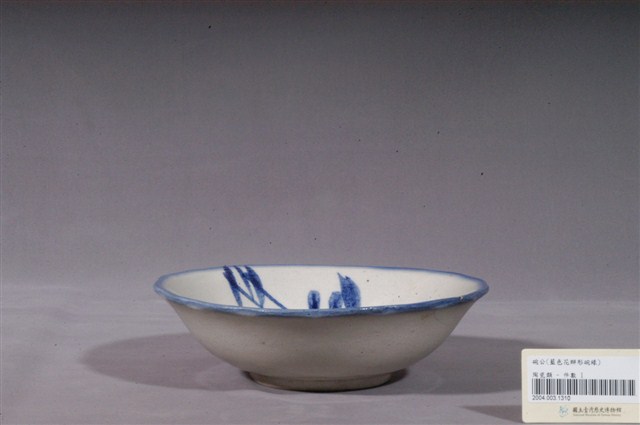 1.青花彩繪竹紋花口碗公,以模製成形,撇口,碗口沿作十六瓣花口造型,弧壁下收,圓弧腹,碗底寬大,碗身淺,底有圈足。全器施白釉,圈足底露胎,胎色米白。口沿以青花鈷料裝飾一圈,碗外壁素面無紋,主要紋飾繪於碗心一側,以褐彩與綠彩描繪土地和草叢,青花繪製的竹幹拔地而起,二旁竹葉搖曳,筆觸隨性生動。2.碗的形制有分較大的湯碗和較小的飯碗,湯碗臺灣民間俗稱「碗公」,多用來盛裝菜湯,是臺灣家庭中常見的民生瓷器。此花口碗為形制較大的湯碗,其口沿特意做成花口邊,頗具特色,葵花、菱花、荷花都是常見的花口造型。