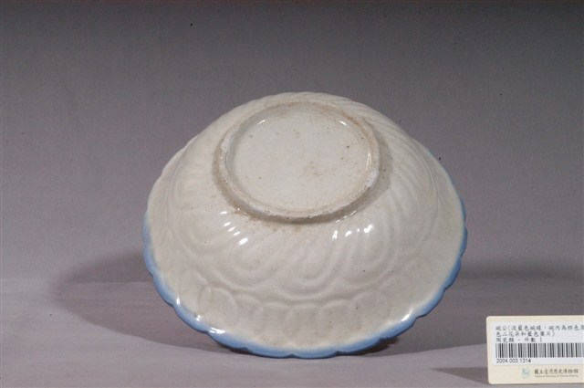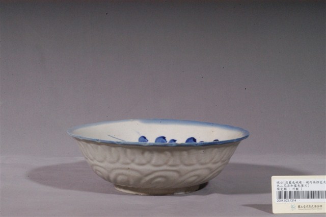 1.青花褐彩花卉紋花口碗公,以模製成形,撇口,弧壁下收,圓腹,碗底寬大略作方折,底有圈足,碗口作菱花瓣造型,共二十三瓣,碗外壁使用壓模技法裝飾淺浮雕圖案,上半部微卷線紋,下半部為花瓣圖案。全器施白釉,圈足底露胎,胎色米白,圈足周圍釉面部分開片。口沿以青花鈷料塗滿裝飾,碗內壁一側以青花、褐彩二朵盛開的花朵為主體,二旁襯青花葉片與褐彩花蕾,構圖頗為勻稱工整,沒骨筆法自然純熟。2.碗的形制有分較大的湯碗和較小的飯碗,湯碗臺灣民間俗稱「碗公」,多用來盛裝菜湯,是臺灣家庭中常見的民生瓷器。此花口碗為形制較大的湯碗,約於光復初期由臺灣北投窯場燒造,其口沿特意做成菱花口邊,頗具特色,另外,荷花和葵花也是常見的花口碗造型。
