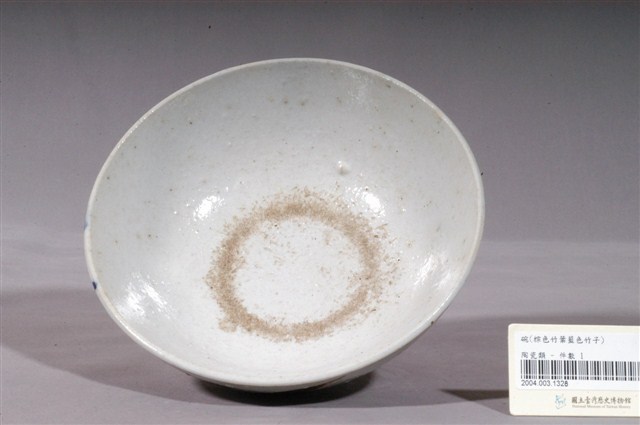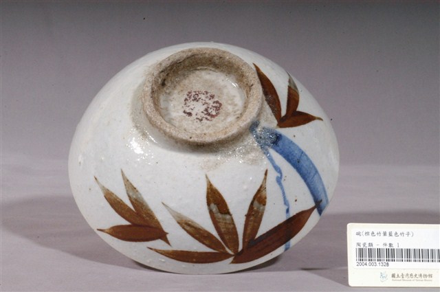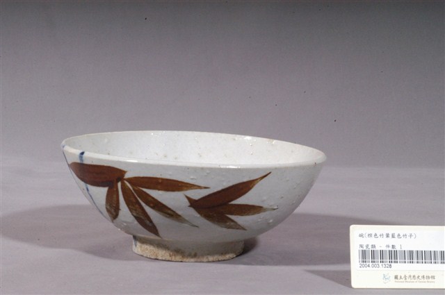 1.青花褐彩竹紋碗公,以模製成形,整體造型略微歪斜,敞口,弧壁下收,圓弧腹,底有圈足。除圈足外全器施白釉,釉色帶灰色調,採疊燒技法,碗心一圈刮釉,胎色灰褐,表面帶有氣孔與凹凸不平的小顆粒,碗外壁圈足上方與外碗心部分縮釉。碗內壁素面無紋,碗外壁一側以青花繪製竹幹,褐彩描繪竹葉,外碗心押印紅褐色落款,字樣難以辨識。2.碗的形制有分較大的湯碗和較小的飯碗,湯碗臺灣民間俗稱「碗公」,多用來盛裝菜湯,是臺灣家庭中常見的民生瓷器。本物件屬於形制較大的湯碗,碗壁上手繪的竹葉紋為碗盤中常見的紋飾,從日治時期一直沿用到光復以後,竹子為松、竹、梅歲寒三友之一,象徵著文人的高尚志節。