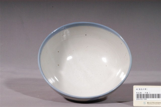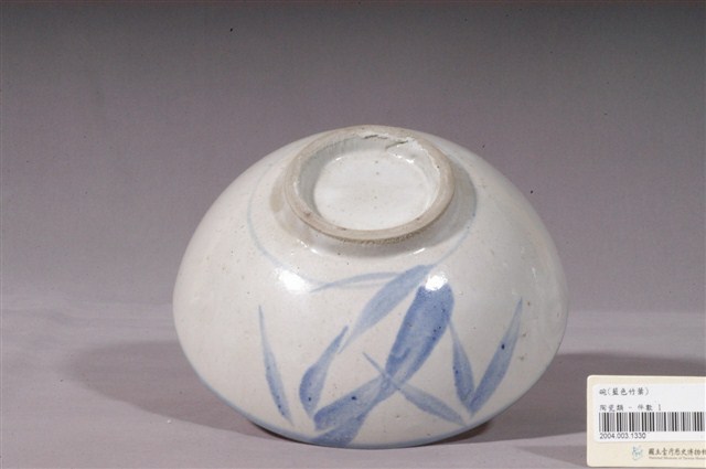 1.青花竹紋碗公,敞口,弧壁下收,圓腹,底有圈足,以模具成形,施鈷料彩繪裝飾後高溫燒製而成。全器施白釉,圈足底露胎,胎色灰白。口沿以青色鈷料塗滿,碗內壁素面無紋,表面有些許小氣孔與褐色斑點,碗外壁下方飾一圈青花弦紋,腹部一側以青花鈷料裝飾竹葉紋,利用釉色深淺創造立體感,錯落的竹葉讓畫面更為生動。2.碗的形制有分較大的湯碗和較小的飯碗,湯碗臺灣民間俗稱「碗公」,多用來盛裝菜湯,是臺灣家庭中常見的民生瓷器。本物件屬於形制較大的湯碗,碗壁上手繪的竹葉紋為碗盤中常見的紋飾,從日治時期一直沿用到光復以後,竹子為松、竹、梅歲寒三友之一,象徵著文人的高尚志節。