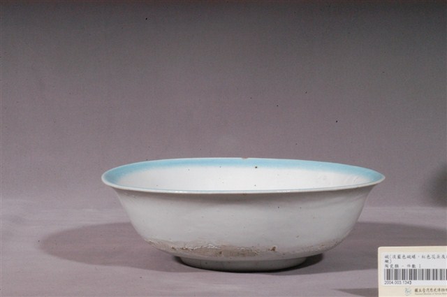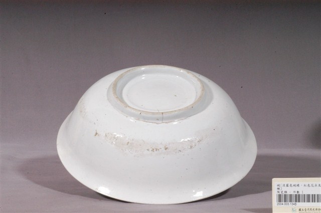 1.本件為彩繪花卉紋碗公,器形呈撇口,淺弧腹,底部有圈足。施釉,器腹外壁施釉不均,有顆粒、氣泡,有開片現象,以碗底、外壁及圈足外緣較為明顯,碗緣一處有缺損。碗緣內壁以一圈淡藍色寬帶做為裝飾,碗內沿器壁與底部交界處,繪有一盛開的紅薔薇及花苞,搭配深綠色及咖啡色莖葉為主圖,主圖兩旁沿著碗底邊緣以紅色和綠色顏料點繪出繁花綠葉意象,畫風簡單寫意。鶯歌碗盤上的紋飾大多以手繪方式表現,粉紅色釉彩的使用亦是鶯歌日用陶瓷裝飾的特點。2.鶯歌陶業始於清嘉慶九年,來自福建泉洲磁灶的吳姓陶工在此開展窯業。清代至日據時期,此地窯業仍以家族經營為主。1930–1960年代,鶯歌為臺灣燒製碗盤的主要地區。1969年北投陶瓷廠關閉,許多窯場逐漸轉移到臺北市近郊的鶯歌地區。使鶯歌地區因為地緣性的關係,發展成為臺灣陶瓷重鎮。