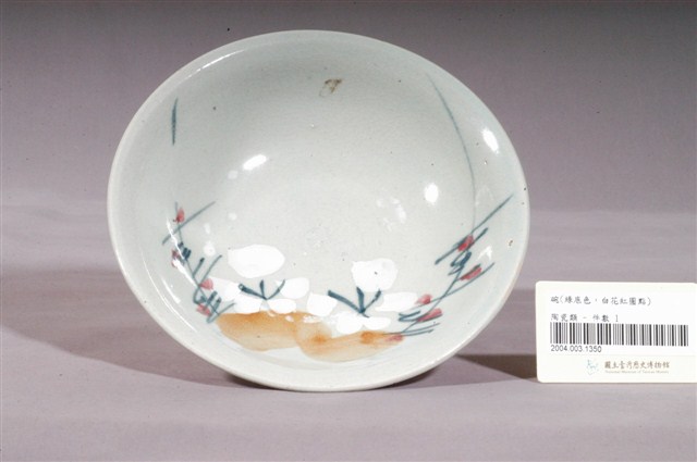 1.本件為彩繪花卉紋碗,器形呈寬敞口,淺器腹,底部有圈足。碗內壁為淺綠色釉,外壁則為白色。碗內面有一咖啡色污漬。碗內面環繞底部邊緣使用白色、綠色、橙色及紅色色料以手繪方式畫上白色折枝花卉襯以紅色小圓點及綠色線條點綴,圖案隨性寫意。手繪花卉紋為鶯歌碗盤上經常出現的紋飾。2.鶯歌陶業始於清嘉慶九年,早期的產品主要是厚重的缽、罐、壺、缸、甕 等廚房日用粗陶器、磚、瓦建築相關器物,以及花盆等,碗盤並不在生產之列。中日戰爭爆發後,日本的陶瓷器不易取得,加上當時有北投的工人轉往鶯歌發展,因而促使鶯歌的製碗業興盛起來。1930–1960年代,鶯歌為臺灣燒製碗盤的主要地區,鶯歌生產的碗盤早期大多為麵食攤及農村所用的器皿,極為厚重粗糙,1950年以後品質逐漸提升。