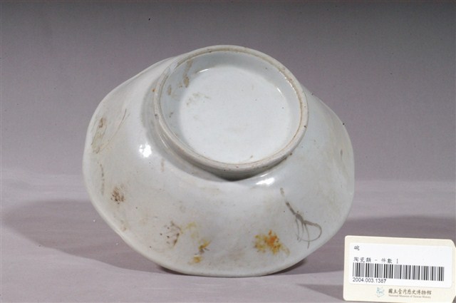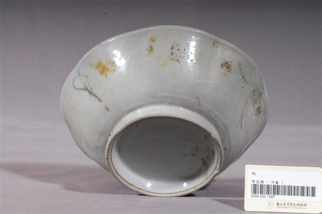 本件灰釉加彩碗,器形呈圓唇,侈口,口沿呈波浪狀、曲弧小。弧壁,壁至底部下收,圈足高且寬,底部可見鏇痕。通體施釉,釉色則呈灰青色。碗壁上有黑釉及橘黃釉手繪釉上彩裝飾,但剝落嚴重,紋飾已模糊不清,僅留幾筆婉轉線條與筆觸痕跡。
