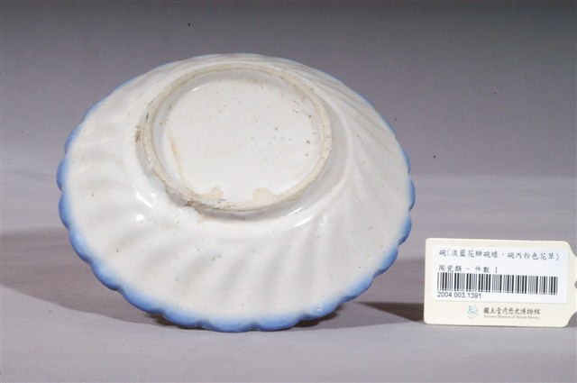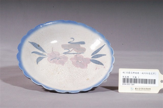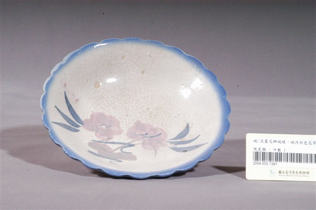 1.本件是青花釉彩花卉紋花口碗,花口外撇,淺弧腹,平底,大圈足。器身壓印斜波紋,使碗壁略有起伏。全器施釉,圈足刮釉露胎,內壁因縮釉而顯現開片現象。裝飾圖案上,口沿施青釉一周,內底手工彩繪簡單的花卉紋飾,裝飾圖案樸素簡率。2.北投窯的裝飾方式大部分以手工繪彩為主,是北投地區的特色之一,在日治時代就已經有釉上及釉下彩兩種。色彩上,初期以單色釉為主,以青花與鐵繪為大宗,戰後增加了青花粉紅彩、青花綠彩,或黃、淺紫色等不同變化。裝飾圖案則常見梅、蘭、竹、菊四君子等花草紋樣,整體風格顯得較為樸實。戰後初期花卉紋仍為最普遍的裝飾紋樣之一,描繪筆法大多率性、隨意,較為抽象簡化。