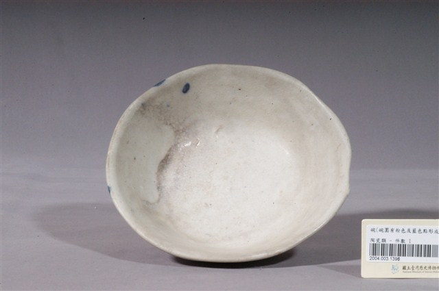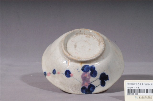 本件彩繪花草紋碗,圓唇,侈口,口沿呈波浪狀,弧壁,壁至底部下收,圈足。通體施釉,釉色則呈米白色,底部有一道縮釉裂痕,並可見細微開片紋。碗壁以青花、紫色釉、及粉紅色釉彩繪花草紋裝飾。繪彩筆跡粗略,構圖自碗壁佈及口沿,風格素樸。從整體質地與釉色來看,可能屬北投地區產製,但仿花口碗的形制較之以往少見。