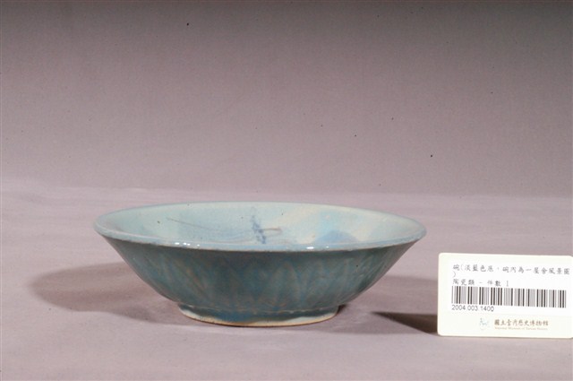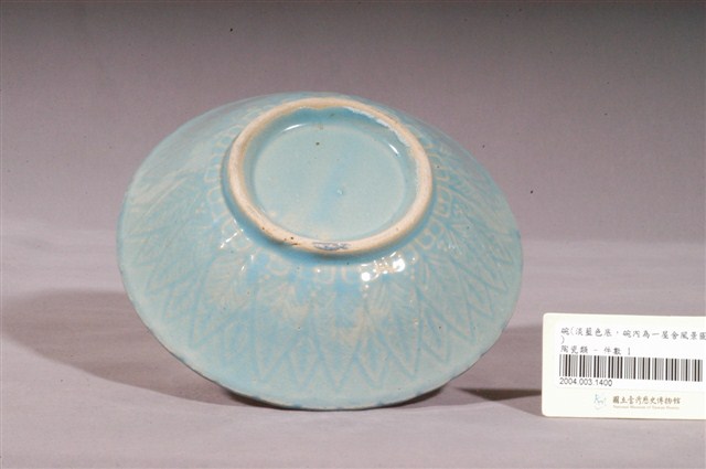 1.這件淡藍色釉印花加彩山水紋碗,器形呈侈口外敞,弧壁下收,寬圈足。胎質細緻,胎色潔白,胎質厚重。通器施釉,以淺藍色釉為地,釉面有光澤。在裝飾技法上,碗外壁以壓印的方式印劃一圈蕉葉紋,圈足周圍印蓮瓣紋。碗內則以印花加彩的方式繪山水紋,以印章沾褐釉蓋屋舍圖案、並以綠釉蓋印樹叢圖案,上再以手工繪彩的方式添加繪水文與樹幹,繪彩圖案簡約隨性。2.日本在明治時期引進西方轉印技術,成為了日本各地窯廠得以大量生產的最佳裝飾工具。這個技術也在日治時代引進臺灣,直到戰後,臺灣各地窯廠也常見使用印花轉寫技術作裝飾的碗盤,可見印花技術自日治時代起便是臺灣十分重要的裝飾技法。
