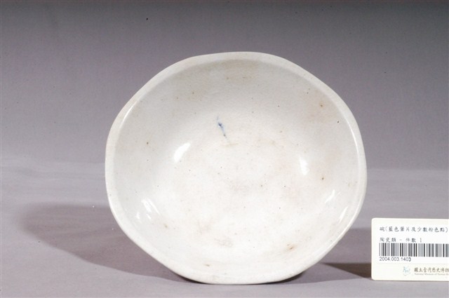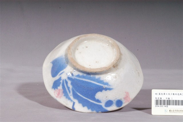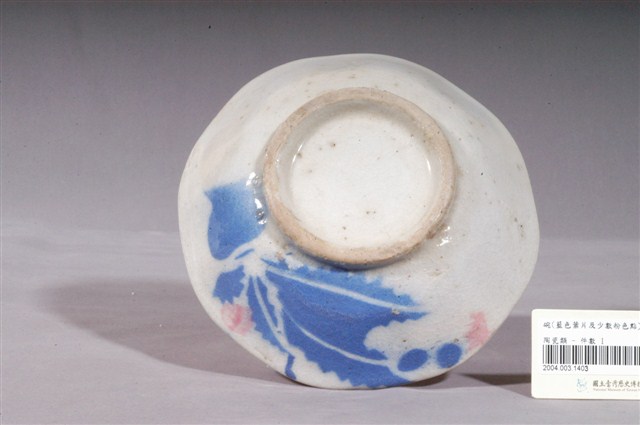 1.這件青花粉紅彩花草紋碗,器形呈圓唇,花口、曲弧小,弧壁至底部下斂,寬圈足。胎體厚重,胎色米白。通體施釉,以白釉為地,釉面有細微開片。在裝飾紋樣上,碗內素面無紋,外壁以印花轉寫技法印青花葉形紋,並搭配粉紅色釉點綴,繪成花草紋樣,裝飾簡約樸素,是臺灣常見的民生陶瓷用品。2.約在日治時代後期至戰後初期,業者引進了氧化鉻作為色料,研發出粉紅色釉並裝飾於花卉紋上,掀起了裝飾上的流行。臺灣自產的花卉紋碗盤,常見使用粉紅色釉搭配青花釉彩繪花卉紋,為早期臺灣碗盤的特色。