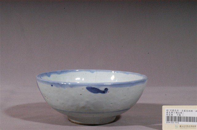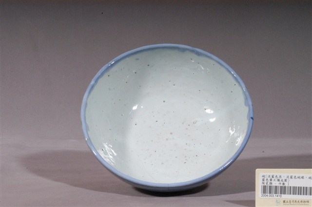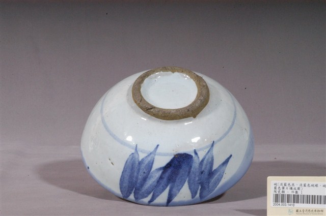 1.淡藍釉青花竹葉紋碗公,敞口,弧壁下收,圓腹,底有圈足,以模具成形,施鈷料彩繪裝飾後高溫燒製而成。全器施淡藍釉,釉料厚重,表面有明顯氣孔,圈足露胎,胎為深褐色。口沿以青色鈷料塗滿,有流釉現象,碗內壁素面無紋,碗外壁下方飾一圈青花弦紋,腹部一側以青花鈷料裝飾竹葉紋,利用釉色深淺創造立體感,圖案另一側口緣處有一不規則深青色塊,應為繪製圖案時無意間沾到青花鈷料所致。2.碗的形制有分較大的湯碗和較小的飯碗,湯碗臺灣民間俗稱「碗公」,多用來盛裝菜湯,是臺灣家庭中常見的民生瓷器。本物件屬於形制較大的湯碗,碗壁上手繪的竹葉紋為鶯歌碗盤中常見的紋飾,從日治時期一直沿用到光復以後,竹子為松、竹、梅歲寒三友之一,象徵著文人的高尚志節。