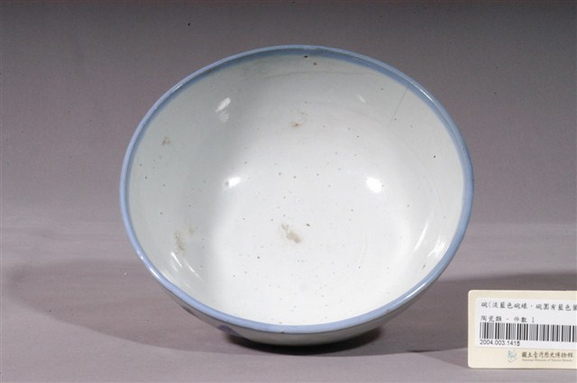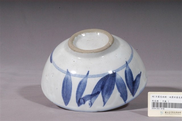 1.青花竹葉紋碗公,敞口,弧壁下收,圓腹,底有圈足,以模具成形,施鈷料彩繪裝飾後高溫燒製而成。全器施白釉,表面有明顯氣孔,圈足露胎,胎色灰褐。口沿以青色鈷料塗滿,發色較淡,碗內壁素面無紋,碗外壁下方飾一圈青花弦紋,腹部一側以青花鈷料裝飾竹葉紋,利用釉色深淺創造立體感,其中一、二片竹葉有流釉痕跡。2.碗的形制有分較大的湯碗和較小的飯碗,湯碗臺灣民間俗稱「碗公」,多用來盛裝菜湯,是臺灣家庭中常見的民生瓷器。本物件屬於形制較大的湯碗,碗壁上手繪的竹葉紋為鶯歌碗盤中常見的紋飾,從日治時期一直沿用到光復以後,竹子為松、竹、梅歲寒三友之一,象徵著文人的高尚志節。