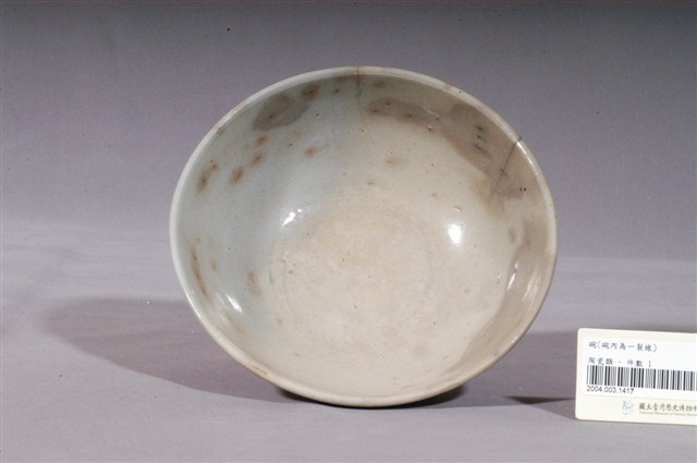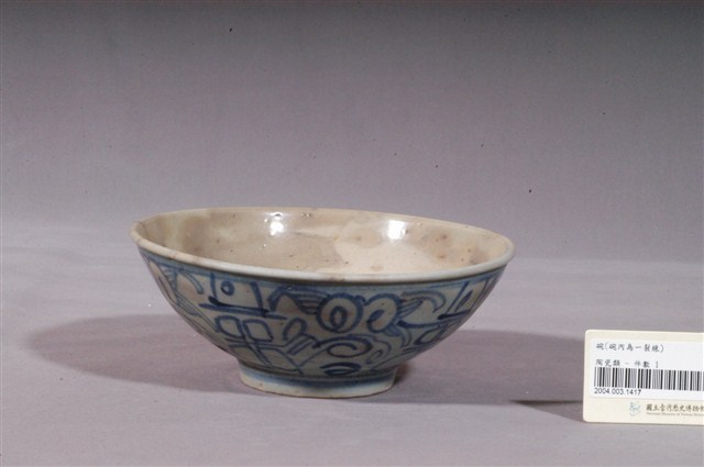 1.本件青花纏枝囍字紋碗,圓唇,口沿外侈,弧壁至底部下收,圈足略小。通體施釉,釉色則呈灰青色,釉面多褐斑、雜質。碗內素面無紋,圈足壁及口沿下方各飾青花弦紋一圈。外壁以鈷藍釉繪纏枝紋及囍字紋,紋樣滿佈碗壁,筆跡隨意率性。整體風格素樸,屬大量產製的民用陶瓷器皿。2.清末民初,華南沿海地區因出口貿易便利的地理優勢,窯業也跟著興起。窯廠至日治時期仍持續生產碗盤外銷,而這些產品也透過貿易往來傳入臺灣,豐富了臺灣常民的生活文化。