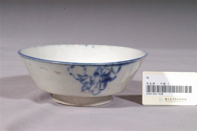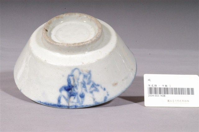 1.本件青花山石紋碗,屬中國華南地區產製之食器,以廣東地區產製的可能性較高。直口,斜直壁,壁至底部內折,下接圈足,碗口有一道裂痕。通體施釉,以青花釉彩為裝飾。碗內除口沿塗一圈青料,底部也繪一圈弦紋,弦紋內蓋印「福」字。外壁繪一圈山體岩石紋樣。整體裝飾簡單素樸,為大量產製的民用陶瓷器皿。2.清末民初,華南沿海地區因出口貿易便利的地理優勢,窯業也跟著興起。窯廠至日治時期仍持續生產碗盤外銷,而這些產品也透過貿易往來傳入臺灣,豐富了臺灣常民的生活文化。