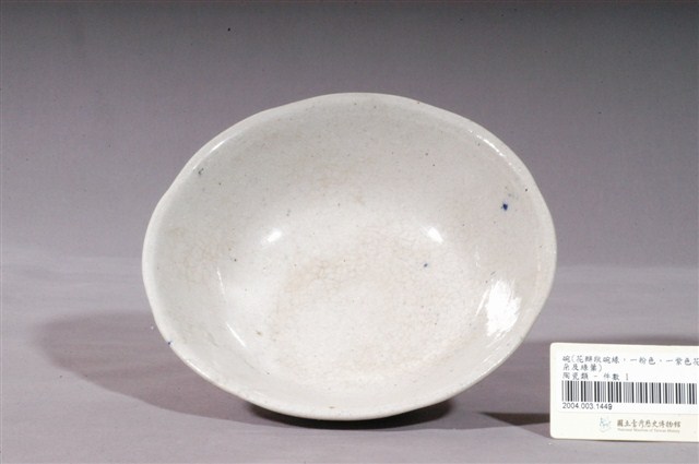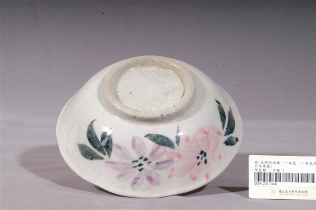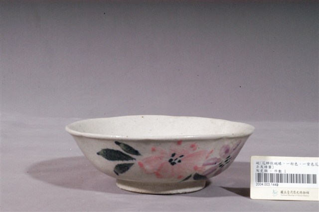 1.本件為彩繪花卉紋碗,器形呈敞開,碗緣為八瓣花口造型,淺弧壁,圈足。胎體灰白,施白釉,有開片現象,碗底較為明顯。碗外壁以畫筆繪上紫色及粉色花朵襯上綠葉做為裝飾。臺灣戰後日用碗盤的裝飾以手繪來表現是常見的手法,可看到以植物花卉、花鳥、魚蝦、風景、幾何圖形、文字紋飾等釉下彩的圖案裝飾碗盤。2.清及日治時期臺灣碗盤陶瓷器主要由日本及中國大陸進口,直到1930年代後在日政府的鼓勵下,本土各地才開始有日用碗盤的量產,南投魚池地區日治時期就有人設窯燒碗,此地的製成品因土質關係,胎體帶灰白色,通常以用舊式的腳踩轆轤製作,製品的精緻程度不如北投、鶯歌等日用碗盤主要生產區。