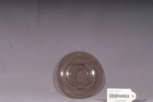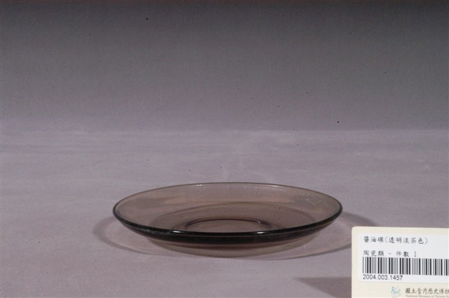 1.淡茶色透明玻璃小碟,圓形,圓弧淺腹,底帶有淺淺的圈足,直徑12.5公分,高1.8公分,以玻璃壓模製作,呈透明淡茶色,碟面與底部為素面,無任何紋樣裝飾,表面可見些許使用磨損痕跡,盤沿留有一點黃褐色汙漬痕。2.碟盤依形制大小區分,形制較小者稱「碟」,形制較大者稱「盤」。本件可能是搭配紅茶或咖啡玻璃杯的杯托小碟(saucer)。