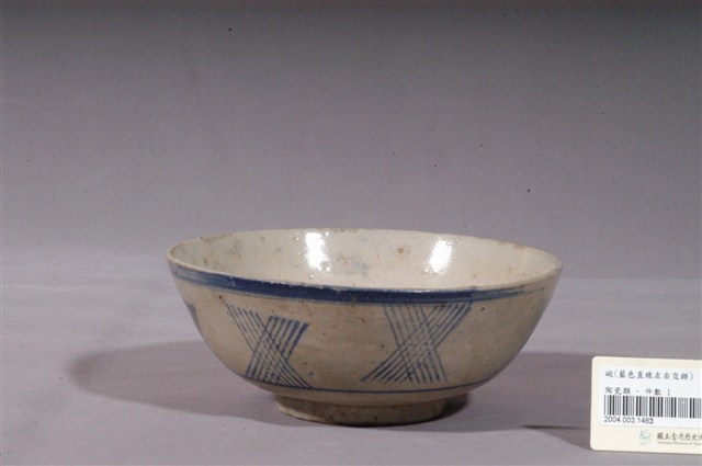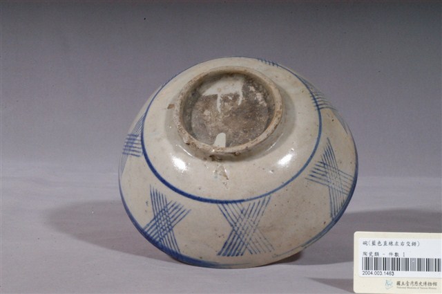 1.青花線紋碗公,敞口,弧壁下收,圓腹,底有圈足,以模具成形,釉下印花青花裝飾之後,高溫燒製而成。採疊燒技法,碗心一圈刮釉,全器施灰釉,表面帶有明顯氣孔,釉面因被汙漬覆蓋泛黃褐色,圈足底與外碗心部分面積露胎,碗外壁底部近圈足處略縮釉與剝釉露胎,胎為褐色。碗內壁素面無紋,碗外壁口沿下方裝飾一圈寬青花弦紋,腹部下方裝飾一圈青花細弦紋,二弦紋之間採印花技法裝飾,等距離蓋印六條線為一組的斜直線紋,左右交錯形成菱格狀,共七組菱格紋飾。2.碗的形制有分較大的湯碗和較小的飯碗,湯碗臺灣民間俗稱「碗公」,多用來盛裝菜湯,是臺灣家庭中常見的民生瓷器。本物件屬於形制較大的湯碗,碗壁上採用印花技法裝飾以增加工作效率,方法是將圖案先刻在橡皮圖章上,以圖章沾染釉料印在器皿上,燒製後即得所需圖案。