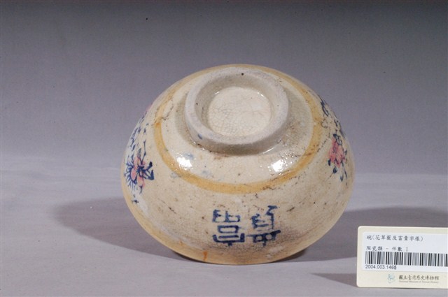 1.金黃閃光釉花鳥富貴字紋碗公,為形制較大的湯碗,民間俗稱「碗公」。敞口,弧壁下收,圓腹,底有圈足,圈足厚實。以模具成形,施白釉高溫燒製後,再以金黃閃光釉與青花、粉彩裝飾二次燒製而成。全器除圈足底外滿釉,胎為白色,碗內外壁開片且帶有明顯氣孔,表面被汙漬覆蓋呈黃褐色,碗外壁腹部中段略縮釉並有一道長裂痕。碗內壁素面無紋,碗外壁口緣與近底處裝飾二圈寬邊金黃色閃光釉,部分已褪色消失,腹部採印花技法沾青花鈷料蓋印二組花鳥紋與「富貴」二字,再以粉紅釉彩填色妝點花瓣,整體紋樣帶有花開富貴的吉祥寓意。2.金黃色閃光釉(Luster)是一種低溫釉上彩,燒製溫度約750℃,施在白色釉藥上,因色料中的金屬氧化物沈澱,使釉面產生金屬光澤。閃光釉發源於中東回教國家,傳入歐洲後成為廣受歡迎的裝飾技法,之後再經由日本傳到臺灣,約於1960年代至1970年代流行於臺灣北部窯廠,搭配吉祥字樣曾廣受宴會場合歡迎,但由於容易褪色,後來便不多見了。