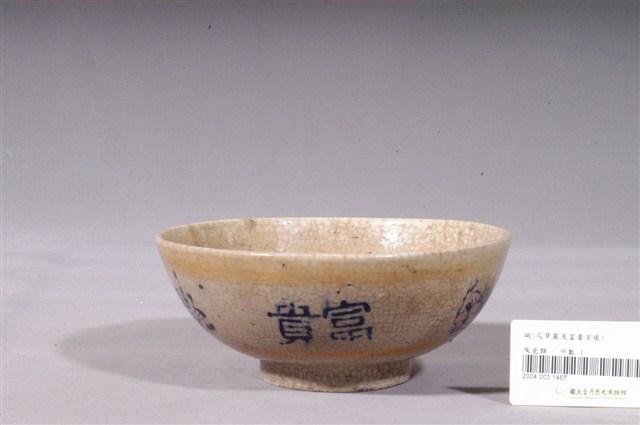 1.金黃閃光釉花鳥富貴字紋碗公,為形制較大的湯碗,民間俗稱「碗公」。敞口,弧壁下收,圓腹,底有圈足,圈足厚實。以模具成形,施白釉高溫燒製後,再以金黃閃光釉與青花、粉彩裝飾二次燒製而成。全器除圈足底外滿釉,碗內外壁佈滿細小開片,整只碗被汙漬覆蓋而呈褐色。碗內壁素面無紋,碗外壁口緣與近底處裝飾二圈寬邊金黃色閃光釉,腹部採印花技法沾青花鈷料蓋印二組花鳥紋與「富貴」二字,花鳥紋部分再以粉紅釉彩填色妝點花瓣,整體紋樣帶有花開富貴的吉祥寓意。2.金黃色閃光釉(Luster)是一種低溫釉上彩,燒製溫度約750℃,施在白色釉藥上,因色料中的金屬氧化物沈澱,使釉面產生金屬光澤。閃光釉發源於中東回教國家,傳入歐洲後成為廣受歡迎的裝飾技法,之後再經由日本傳到臺灣,約於1960年代至1970年代流行於臺灣北部窯廠,搭配吉祥字樣曾廣受宴會場合歡迎,但由於容易褪色,後來便不多見了。