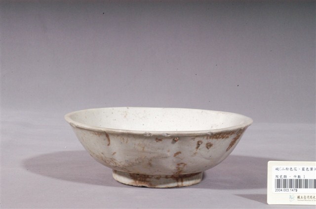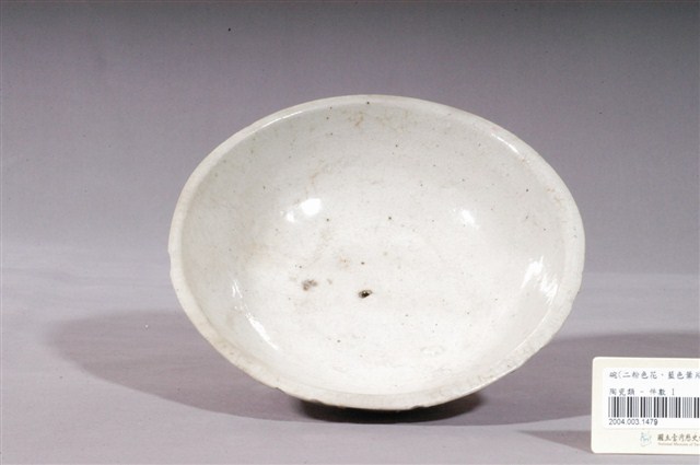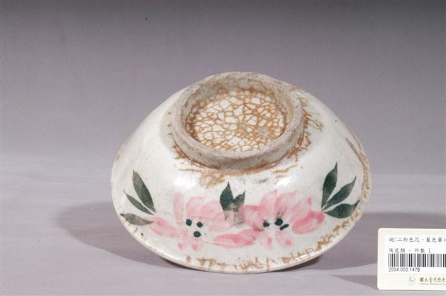 1.本件為彩繪花卉紋碗,器形呈敞開,碗緣為八瓣花口造型,淺弧壁,圈足。胎體灰白,施白釉,有開片現象,碗底較為明顯。碗外壁以畫筆繪上兩朵粉色花朵襯上綠葉做為裝飾。臺灣戰後日用碗盤的裝飾以手繪來表現是常見的手法,可看到以植物花卉、花鳥、魚蝦、風景、幾何圖形、文字紋飾等釉下彩的圖案裝飾碗盤。2.清代至日治時期臺灣碗盤陶瓷器主要由日本及中國大陸進口,直到1930年代後在日政府的鼓勵下,本土各地才開始有日用碗盤的量產,南投魚池地區日治時期就有人設窯燒碗,此地的製成品因土質關係,胎體帶灰白色,通常以用舊式的腳踩轆轤製作,製品的精緻程度不如北投、鶯歌等日用碗盤主要生產區。