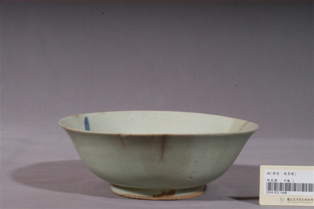 1.本件為手繪山水鳥紋碗,器形呈撇口,弧壁,淺圈足。淺綠釉色,有顆粒、氣孔,口沿處沿著器壁有咖啡色裂痕及撞傷缺損。碗內面底部以綠色、藍色、黑灰色、白色及紅色顏料,用簡易的筆觸表現兩隻小鳥並排站在水邊枝頭,而一隻白鶴正展翅飛翔的的風景意象。花鳥紋裝飾應用在器物上通常有著吉祥如意、花鳥鳴春等祝頌美好景致、境遇的寓意和象徵。2.鶯歌陶業始於清嘉慶九年,早期的產品主要是厚重的缽、罐、壺、缸、甕 等廚房日用粗陶器、磚、瓦建築相關器物,以及花盆等,碗盤並不在生產之列。中日戰爭爆發後,日本的陶瓷器不易取得,加上當時有北投的工人轉往鶯歌發展,因而促使鶯歌的製碗業興盛起來。1930–1960年代,鶯歌為臺灣燒製碗盤的主要地區,鶯歌生產的碗盤早期大多為麵食攤及農村所用的器皿,極為厚重粗糙,1950年以後品質逐漸提升。