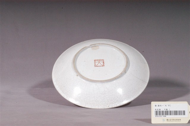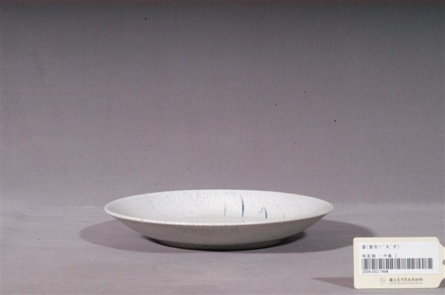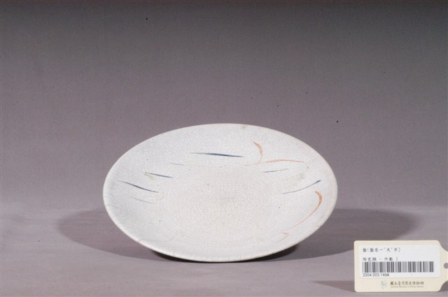 手繪線紋圓盤圓唇,敞口,淺腹,斜壁下收至圈足,矮圈足,足徑略大,平底露胎,胎色淺且細膩,有明顯的刮釉痕跡。全器施以透明釉後入窯釉燒,呈色潤白帶有內斂的光澤,器表滿佈細碎的開片痕跡。本件作品經高溫燒製因而在器表產生些微的氣孔,且全器有經久使用後的龜裂痕跡與染色、沈澱現象,圈足亦有幾處破損。盤外壁素面無紋飾,主要紋飾繪於盤面側緣,以鈷藍、胭脂紅釉手繪數筆隨性排列的短線條,增添盤面變化。整體而言,淨白潤澤的釉色以及細小的開片成為本件作品最大的特色,具有簡約樸實的審美趣味。器底圈足內有紅色回字紋方形款識,內書「天