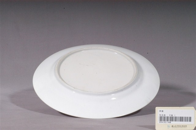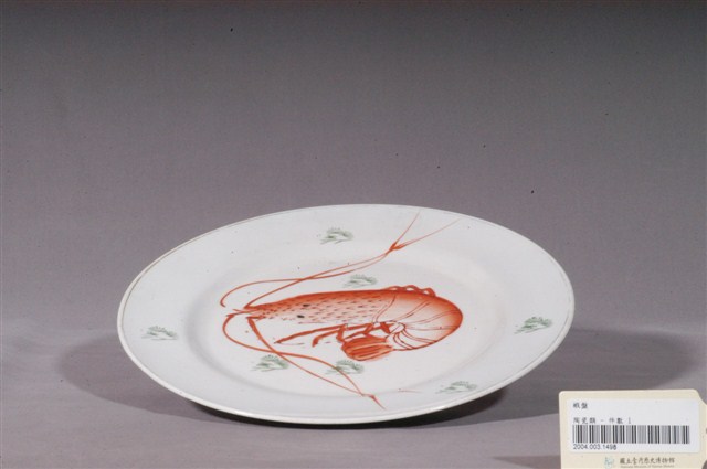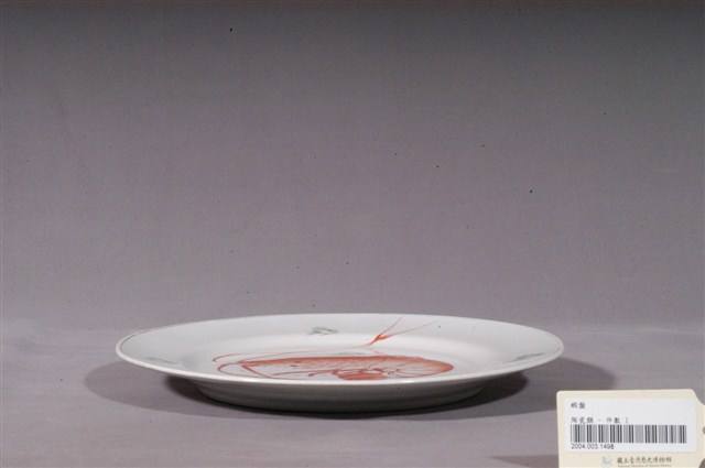 1. 印繪紅蝦折沿淺圓盤為高溫燒製且以模具塑成形,圓唇,寬折沿,口沿平滑,淺腹,下斂至圈足,圈足露胎,胎色白皙,胎質細膩。全器施白釉,呈色淨白潤澤,釉面光滑。盤外壁素面無紋,口沿處以金色釉描繪弦紋。主要紋飾繪於盤內中心,以紅釉轉印一大蝦,蝦身肥短,刻畫寫意童趣。紅釉發色飽和濃重,以漸層染表現身軀立體感。蝦身周圍則以數筆綠釉繪出結組水草紋飾,增添水中趣味。2. 此款白瓷盤為1960年代常見的日用器皿,而蝦蟹等殼甲類的紋樣時常作為民間日常用器之裝飾紋樣,因為殼甲諧音「科甲」,帶有高中的吉祥寓意,廣受大眾歡迎