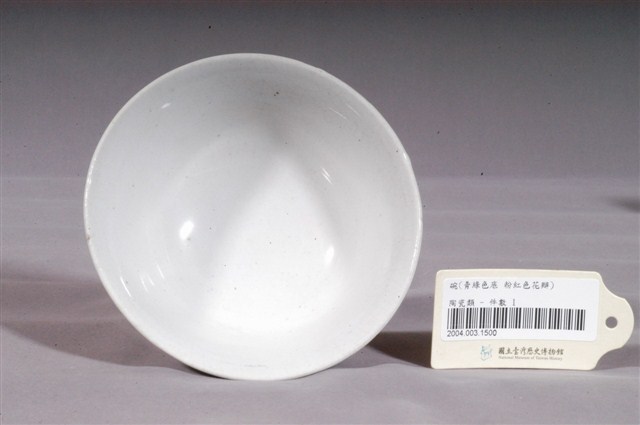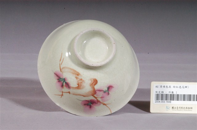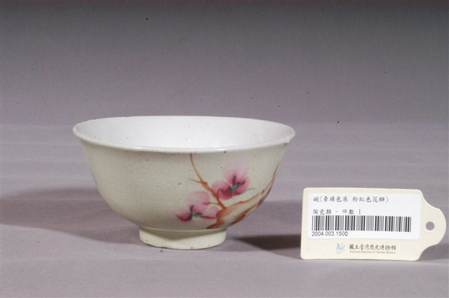 1.淡綠釉彩繪花卉紋碗,以模製成形,撇口,弧壁下收,圓腹,底有圈足。碗內壁素面無紋,施白釉,表面帶有氣孔,口緣釉面開片,碗外壁與外底心施淡綠釉,釉面開片,圈足底露胎,胎為白色。碗外壁一側以綠、褐、粉紅彩描繪折枝花卉紋,褐彩繪製粗幹與細枝,樹稍三朵粉紅花盛開,再以綠色線條勾勒蕊心,利用筆觸與深淺色彩創造枝幹紋理與立體感,整體畫面生動鮮明。2.碗的形制有分較大、臺灣民間俗稱「碗公」的湯碗和形制較小的飯碗。本物件屬於形制較小的飯碗,碗壁上的粉紅彩紋飾經常出現在鶯歌碗盤中,這種釉彩的應用在日治時期已開始流行,戰後仍沿用許久。早期碗盤多只用青花裝飾,約1950年代業者開始使用粉紅彩搭配青花,之後又出現綠色、褐色等其他顏色的著色劑,發展出釉下多彩,使裝飾色彩應用更加多元。