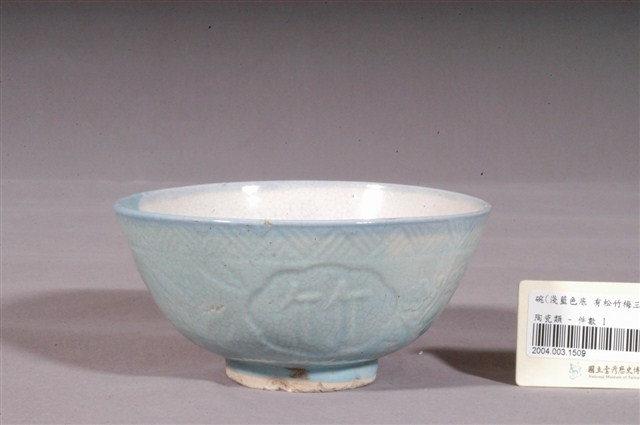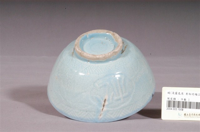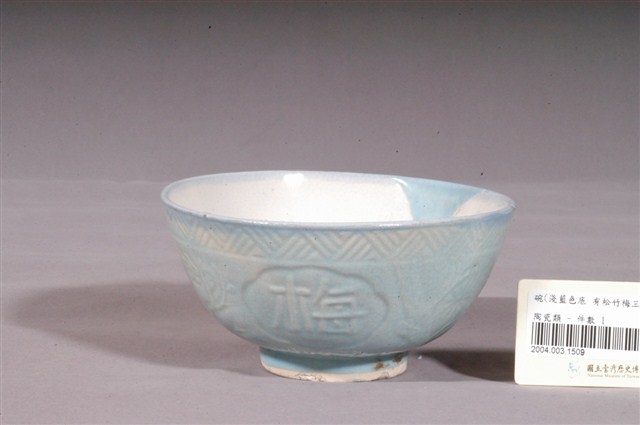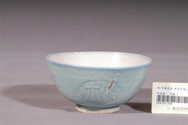 1.淡藍釉松竹梅紋碗,以模製成形,敞口,弧壁下收,底有圈足。碗內壁素面無紋,外碗壁上下各壓模一道蓆紋飾邊,中央等距離壓模三個花邊開光,內刻「松竹梅」三字陽紋,字與字之間壓印松、竹、梅花卉紋樣與文字搭配,碗底心壓印同心圓面與細弦紋,增添造型變化。碗內壁施白釉,口沿一道流釉至碗心,另有一道褐色短直紋,碗壁一側釉面開片,碗心些許剝釉露胎。碗外壁與碗底心施淡藍釉,近似天青色,釉面開片,口沿施塗一圈青色釉,圈足底露胎,帶有許多小裂紋,圈足上方與腹部亦有幾道長條狀露胎,胎色灰褐。碗外壁的釉色隨著壓模紋飾深淺變化,凹陷的地方積釉顏色較深,凸起的地方釉色較淡,深淺交錯,富有漸層之美。2.碗的形制有分較大、臺灣民間俗稱「碗公」的湯碗和形制較小的飯碗。本物件屬於形制較小的飯碗,其釉色和淺浮雕裝飾技法,可歸類為「淡青碗」的一種。淡青碗最早可能是由臺灣鶯歌任職於泉興窯的周安華所開發,最早的釉色是淡綠色,後來又開發出淡藍色、淡褐色等其他顏色。此件淡清碗的釉色為水藍色,又被稱作「水清碗」。