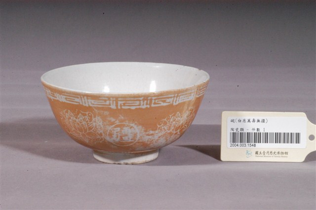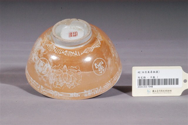 1.這件閃光釉萬壽無疆紋小碗,器形呈圓唇,直口、口稍微歪斜,弧壁,圈足略高,足內署紅色「共益磁器」商標。整體以蓋印的方式作裝飾,碗口下一圈回形紋,器身四個圓形開光,內屬「萬壽無疆」四字,開光間以蓮花紋裝飾,碗底並作一圈變形葉紋。圖案以反白方式呈現,是運用蠟的排水性而產生的裝飾技法。其作法是用蠟在坯體上畫出圖樣,塗上釉料後,蠟不附著釉藥,使原先上蠟之處便留下反白花紋裝飾。萬壽無疆紋飾寓意吉祥,頗受市場歡迎。2.鶯歌窯業的發展與北投窯業的興衰息息相關。戰後初期,鶯歌陶瓷工業急速發展,一批原來在北投的陶瓷技術人員也移到鶯歌開業。這些來自北投的技術人員將生產碗盤、瓷磚、耐火材料的技術與裝飾紋樣傳播到鶯歌,進一步支持了鶯歌窯業的發展。