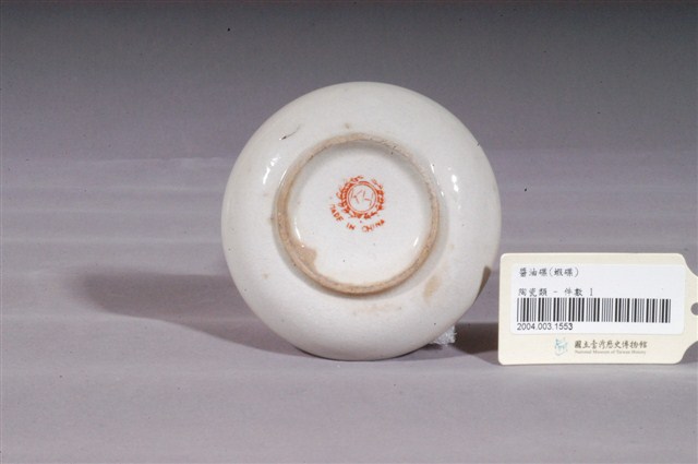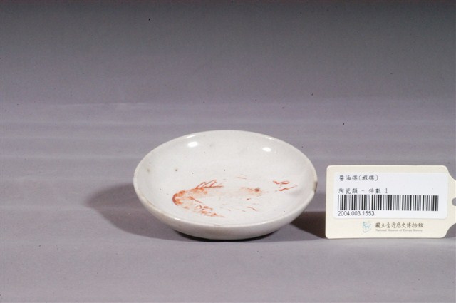 1. 印繪白瓷紅蝦圓碟圓唇,平口,淺腹,弧壁下收至圈足,圈足露胎,胎色白皙,胎質略粗,圈足周圍略有窯沙沾黏。全器施白釉,釉色微微泛黃,釉面光潔,不過器表有許多因高溫燒製導致而成的氣孔,釉面較不平整。碟外壁素面無紋飾,碟心轉印一紅色大蝦紋樣,蝦紋紅釉發色較淡,但因長年使用造成紅蝦的填色及輪廓線更加模糊不清,但據部分線條,仍可見原造形活潑生動,整體紋樣圖案化。圈足內有一「KH」款識,其四周以雙線圓環圈起,外層再以桂冠圖樣為邊飾,下方書「MIDE IN CHINA」。2. 尺寸較小、器深較淺的碟子俗稱「醬料碟