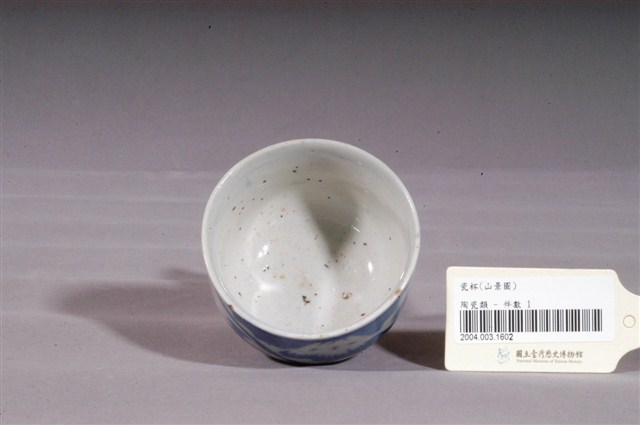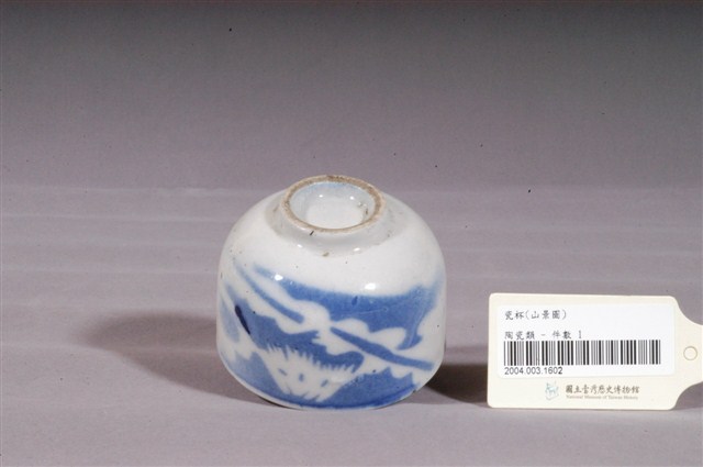 1.噴繪青花富士山紋瓷杯,以模製成形,敞口,直壁,圓腹,底有圈足。全器施白釉,圈足底露胎,胎色灰褐。碗內壁素面無紋,有明顯氣孔與黃褐色斑點,碗外壁一側採用噴繪技法,以青花鈷料裝飾富士山風景,因上釉藥的方式是使用噴槍,青花圖案發色深淺不一,也可見紋樣邊界的釉彩略微發散開來呈霧狀。2.噴繪技法是鐵片或銅版先將圖案做成鏤空的版型,再將版型貼近胚體,使用噴槍將色料噴上去,鏤空的地方沾上色料,被覆蓋的地方留白,燒製後即成所需圖案。噴繪技法是從日本引進,最早多用在富士山圖案的繪製,後來也設計出白兔、鶴紋、魚蝦等造型