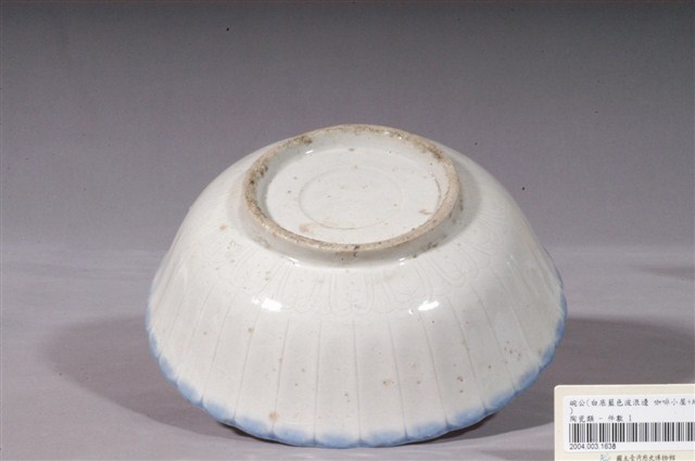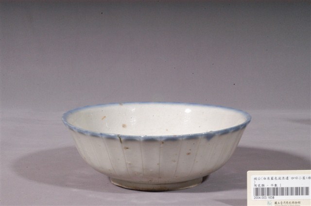 1.這件彩繪海景圖花口碗,是北投窯廠產製的日用陶瓷器皿。花口外折、曲弧不明顯、塗青料一周作裝飾,深圓腹,弧壁至底部微下折,寬圈足。器形仿花的造形,碗壁壓印一圈放射狀長線,近底部圈足周圍印一圈門形紋,似花瓣與花托,整體意圖製造如花朵盛開的效果。通體施釉,釉色呈乳白色,器表有些許顆粒、雜質,並有細微開片。內壁手工彩繪海景圖案,先以印花技法蓋印房舍圖案,再用大筆青花繪出海洋、墨綠釉點繪樹叢、褐釉繪沙灘、樹幹、鳥群。2.日人進入北投經營窯業,也將日本時常使用的陶畫題材引進臺灣,海景圖即是其中一個例子。這種風景圖案的構圖大多是左側海洋中有出航的船舶,右側岸上有屋舍、樹木,上方繪遠山及鳥群,不過依裝飾技法與繪彩筆跡稍有細微差異。海景圖從日治時代起便被使用在日用器皿上,為北投窯廠日用陶瓷中常見的紋飾,直到戰後仍被持續運用。