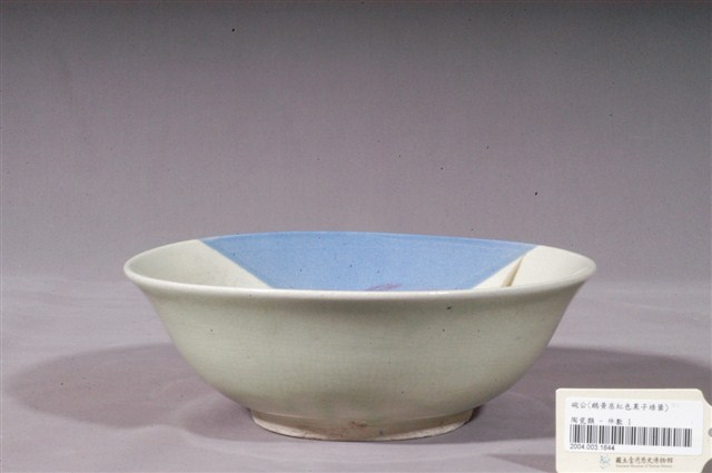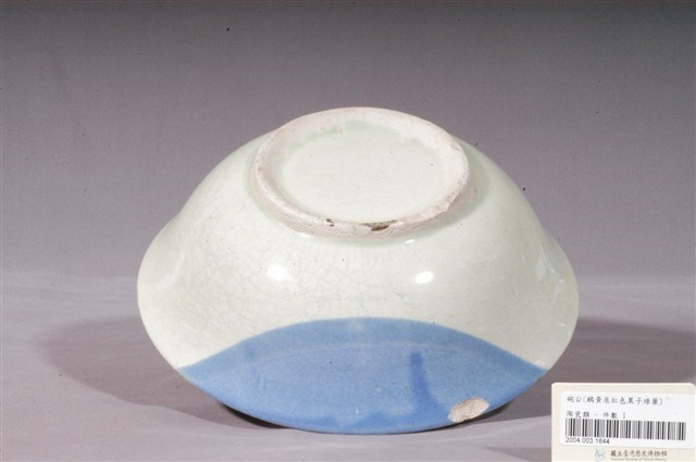 1.本件為彩繪水果紋碗公,器形呈撇口,弧壁,底部有圈足。施米黃色釉,多顆粒、氣泡,有開片現象但不明顯。碗緣沿著碗壁有一內外對稱淺藍色弧形區塊,內壁的藍色弧形區塊上靠近底部有繪有兩顆帶有橄欖綠色果柄及葉片的淺紅色水果,畫風簡單寫意。手繪法為鶯歌碗盤上紋飾的主要特色。2.鶯歌陶業始於清嘉慶九年,早期的產品主要是厚重的缽、罐、壺、缸、甕 等廚房日用粗陶器、磚、瓦建築相關器物,以及花盆等,碗盤並不在生產之列。中日戰爭爆發後,日本的陶瓷器不易取得,加上當時有北投的工人轉往鶯歌發展,因而促使鶯歌的製碗業興盛起來。1930–1960年代,鶯歌為臺灣燒製碗盤的主要地區,鶯歌生產的碗盤早期大多為麵食攤及農村所用的器皿,極為厚重粗糙,1950年以後品質逐漸提升。